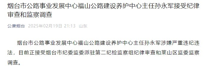 烟台市公路事业发展中心福山公路建设养护中心主任孙永军涉嫌严重违纪违法,目前正接受烟台市纪委监委派驻第二纪检监察组纪律审查和莱山区监委监察调查。